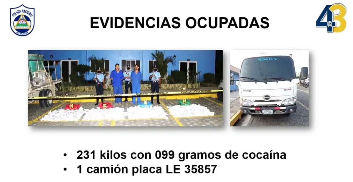En otro golpe contundente al narcotráfico internacional, la Policía Nacional de Nicaragua capturó en el departamento de León, a dos sujetos con más de 231 kilos de cocaína valorados en 5 millones 777 mil 475 dólares en el mercado...