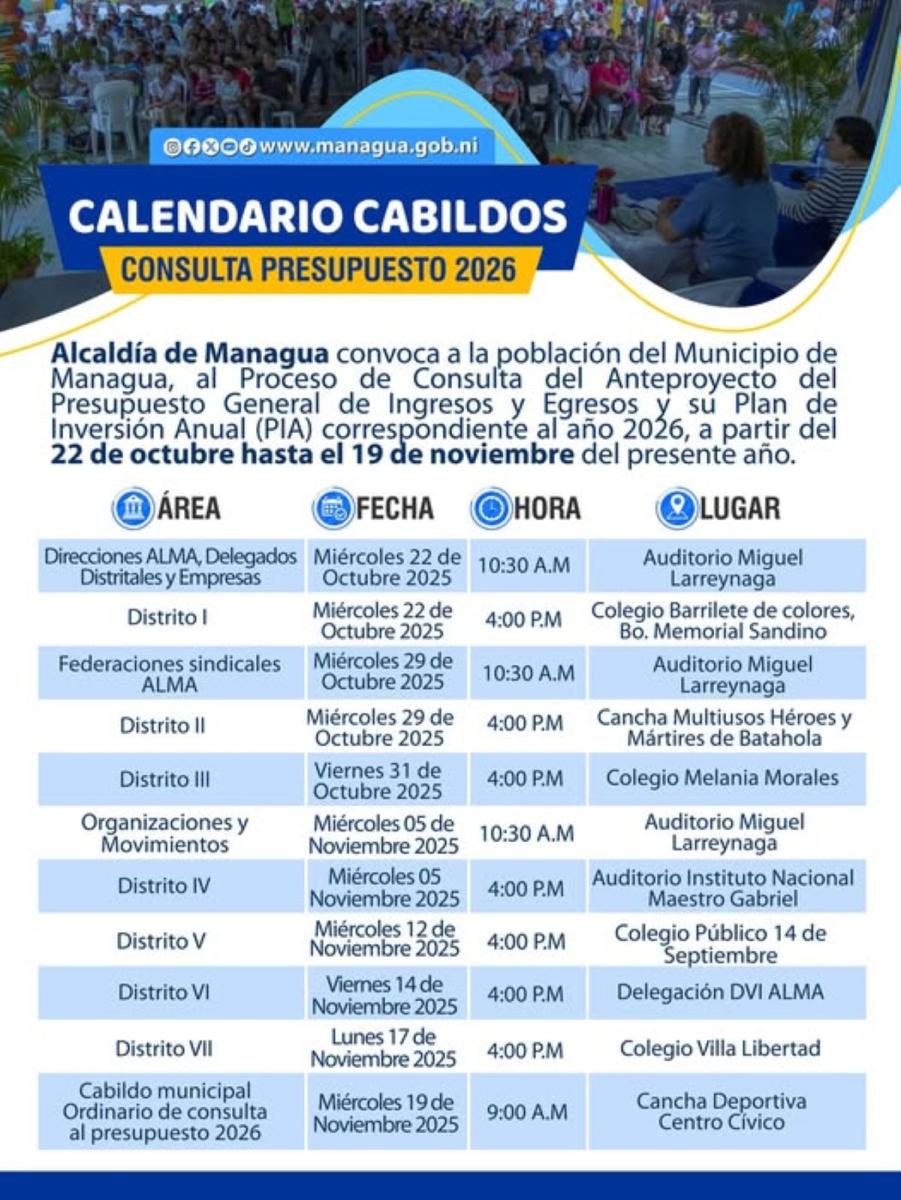 Los cabildos municipales de consulta del presupuesto 2026 del Plan de Inversión Anual de la Alcaldía de Managua, se desarrollarán del 22 de octubre al 19 de noviembre, en la que los habitantes de barrios y comunidades, proponen los proyectos que mejoren sus vidas.