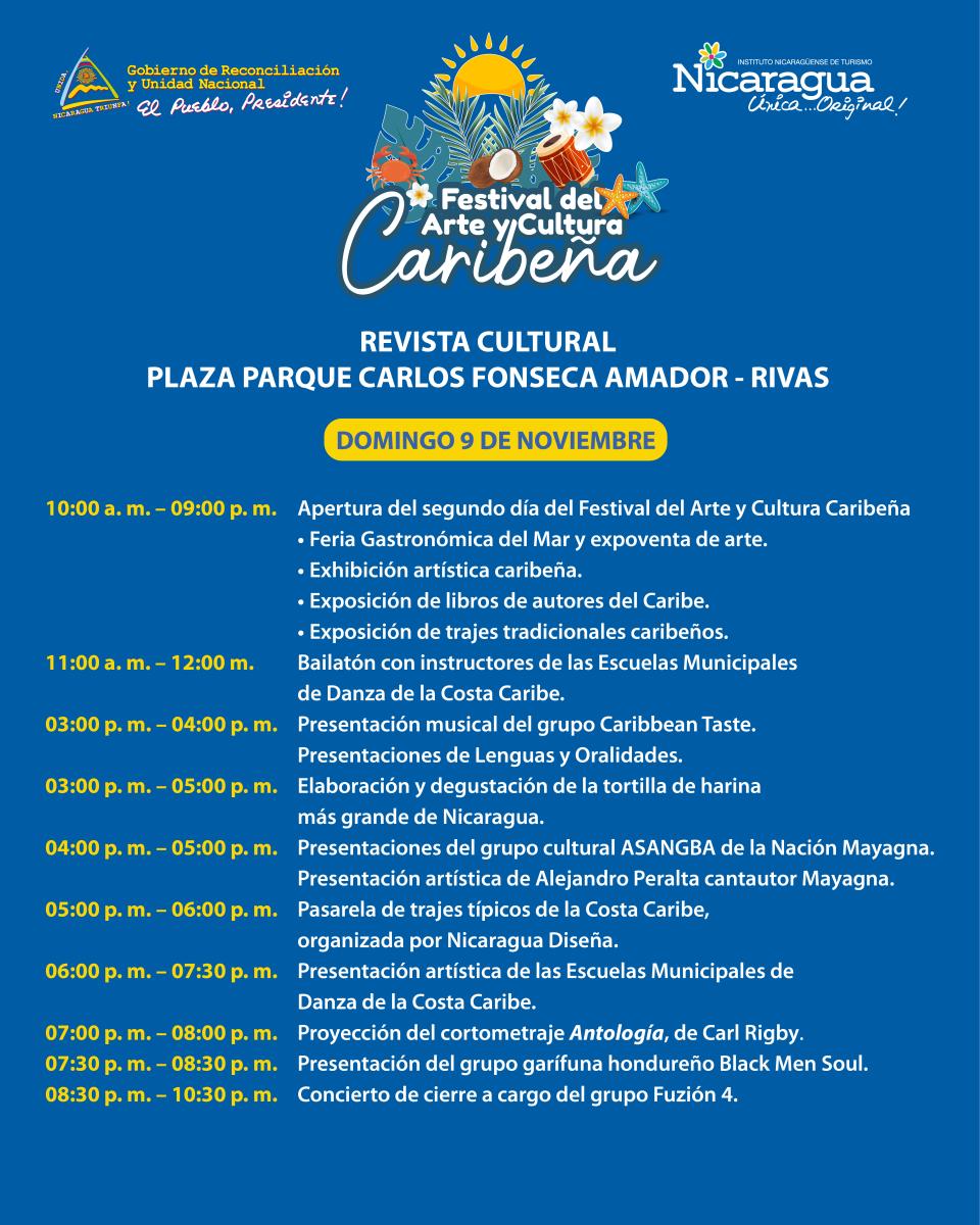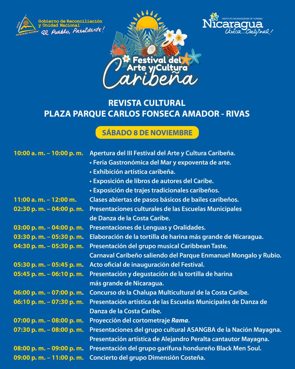 Los sabores, colores y ritmos de la Costa Caribe nicaragüense se tomarán Rivas este fin de semana durante el Tercer Festival del Arte y Cultura Caribeña, que se realizará los días 8 y 9 de noviembre en la Plaza Carlos Fonseca.