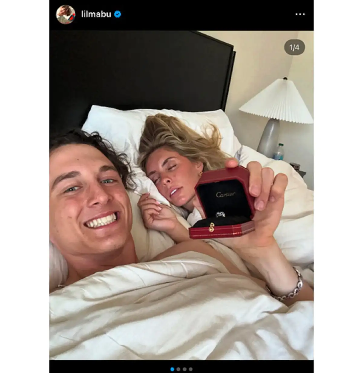 En la imagen, en la cual se confirma el compromiso, se ve a Lil muy sonriente y a Bonnie Blue dormida, mientras él muestra el anillo de compromiso.